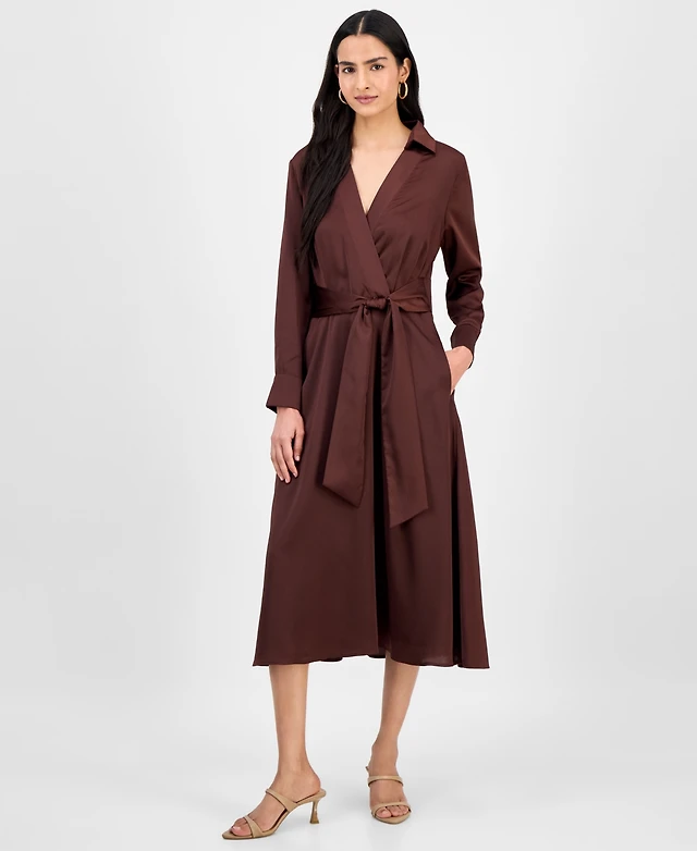 Tahari Asl Women's Collared V-Neck Tie-Waist Midi Dress