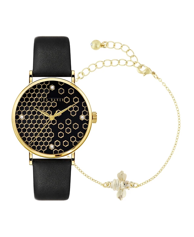 Ted Baker Women's Phylipa Beehive Black Leather Strap Watch 37mm and Bracelet Gift Set, 2 Pieces