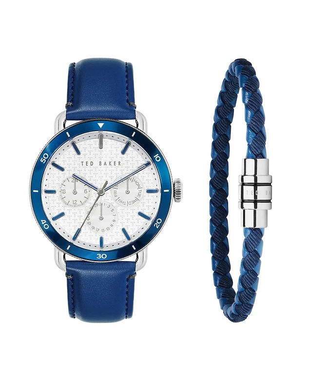 Ted Baker Men's Magarit Blue Leather Strap Watch 46mm and Bracelet Gift Set, 2 Pieces