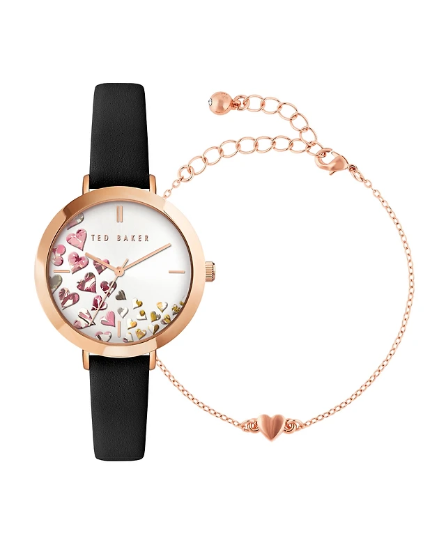 Ted Baker Women's Ammy Hearts Black Leather Strap Watch 34mm and Bracelet Gift Set, 2 Pieces