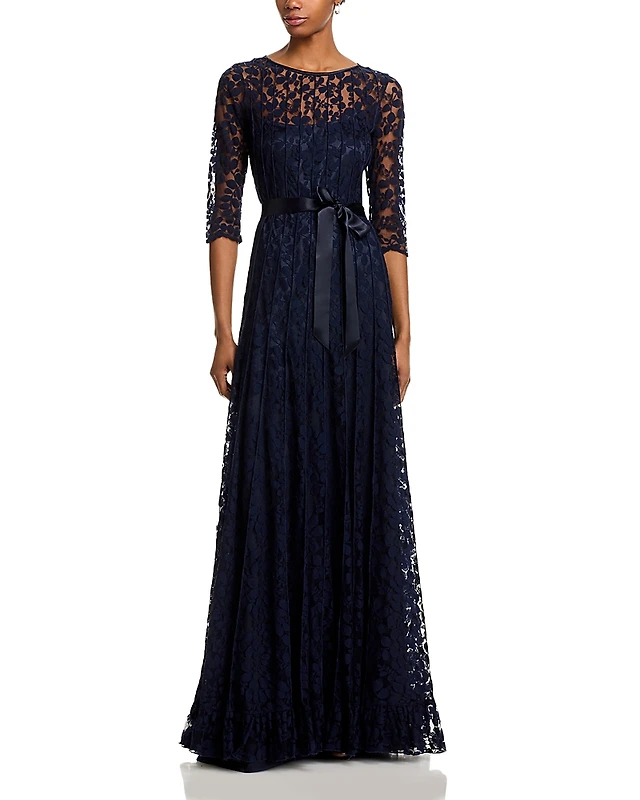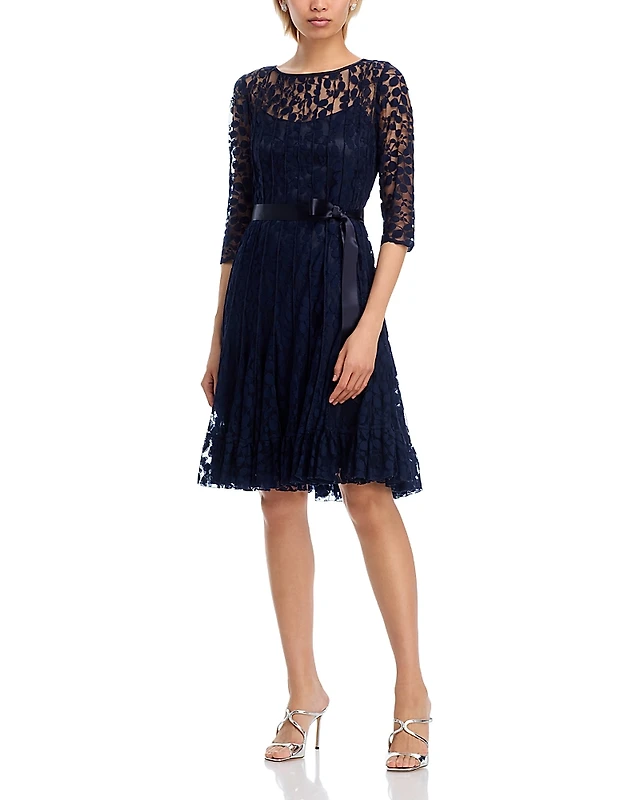 Teri Jon by Rickie Freeman Leaf Lace Pintuck Dress