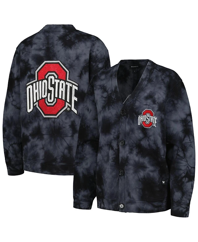 Women's The Wild Collective Black Ohio State Buckeyes Jeweled Tie-Dye Button-Up V-Neck Sweater