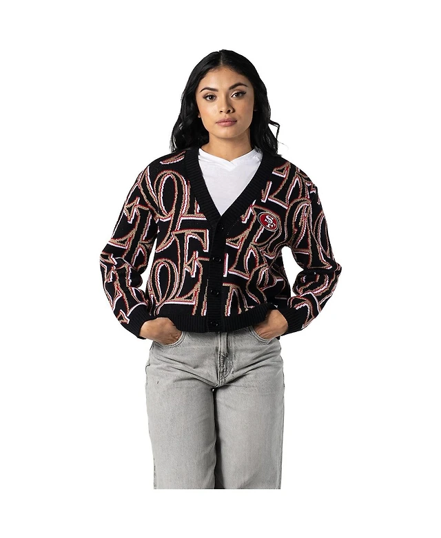 The Wild Collective Women's Black San Francisco 49ers Cropped Full-Button Cardigan Sweater