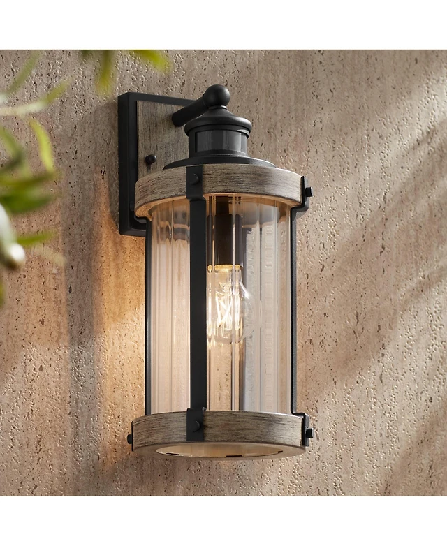 Oberlin Rustic Industrial Farmhouse Outdoor Barn Light Fixtures Set of 2 Black Dusk to Dawn Motion Sensor 9" Clear Seedy Glass for Exterior Deck
