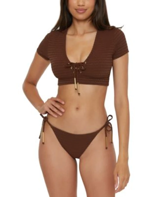 Trina Turk Womens Glimmer Lace Up Crop Swim Tee Top Bikini Bottoms