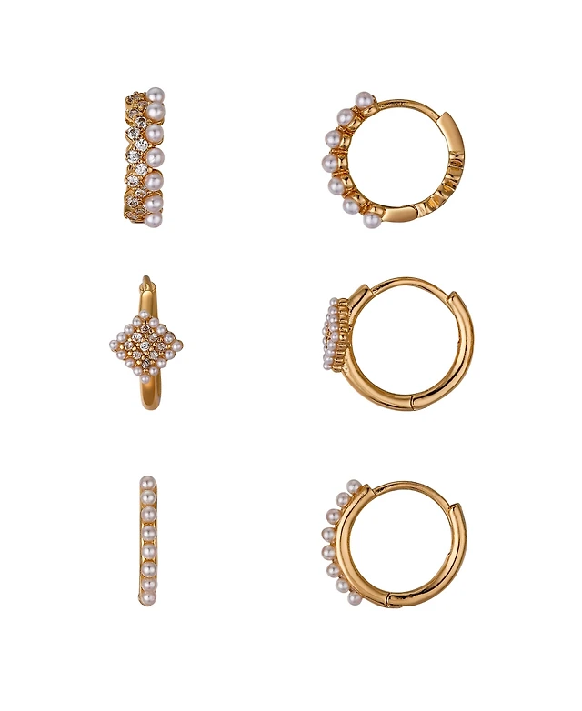 Unwritten 14K Gold Flash Plated Cubic Zirconia and White Imitation Pearl Hoop 6-Piece Earring Set