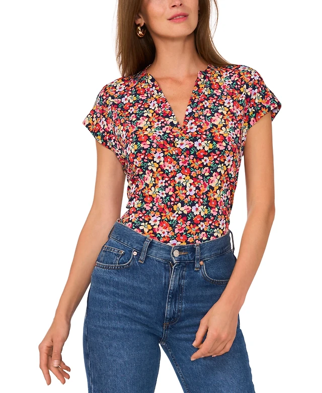 Vince Camuto Women's Floral-Print Split-Neck Cap-Sleeve Top