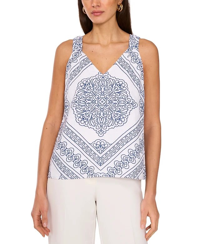 Vince Camuto Women's Linen-Blend V-Neck Printed Sleeveless Top