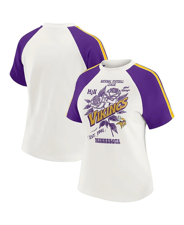 Wear by Erin Andrews Women's White Minnesota Vikings Sleeve Stripe Distressed Raglan T-Shirt