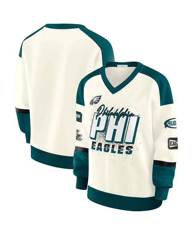 Wear by Erin Andrews Women's Cream Philadelphia Eagles Racing Crew V-Neck Sweatshirt