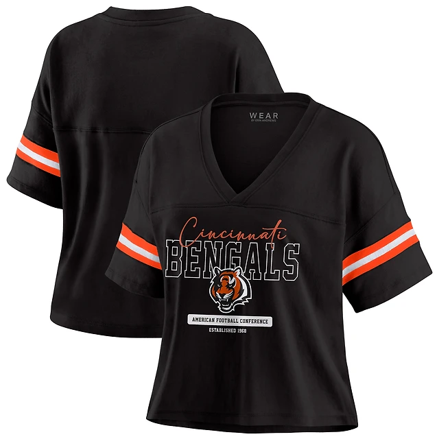 Women's WEAR by Erin Andrews Black Cincinnati Bengals Color Block Boxy Modest Crop V-Neck T-Shirt