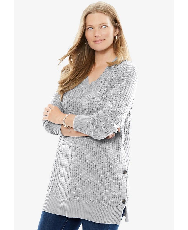Woman Within Plus Side Button V-Neck Waffle Knit Sweater