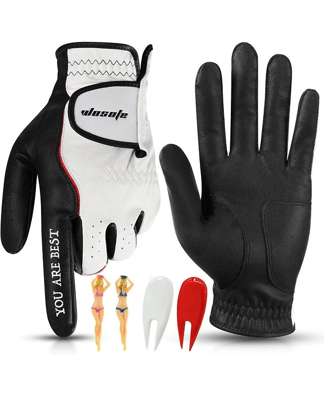 Wosofe Men s Golf Glove Left Hand Premium Leather Excellent Grip Super Soft Breathable Durable Fit All Weather with Golf Tee and Divot Repair Tool,Med