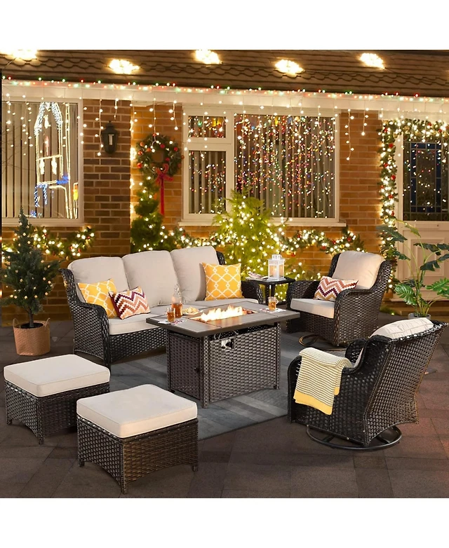 Xizzi Patio Furniture Sets Outdoor Swivel Rocking Chairs with 50,000 Btu Propane Fire Pit Table 7 Pieces All Weather Pe Wicker Conversation Sofa and M