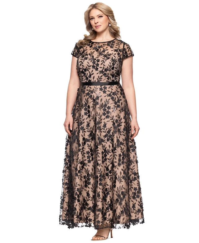 Xscape Plus 3D-Floral Embroidered Off-The-Shoulder Dress