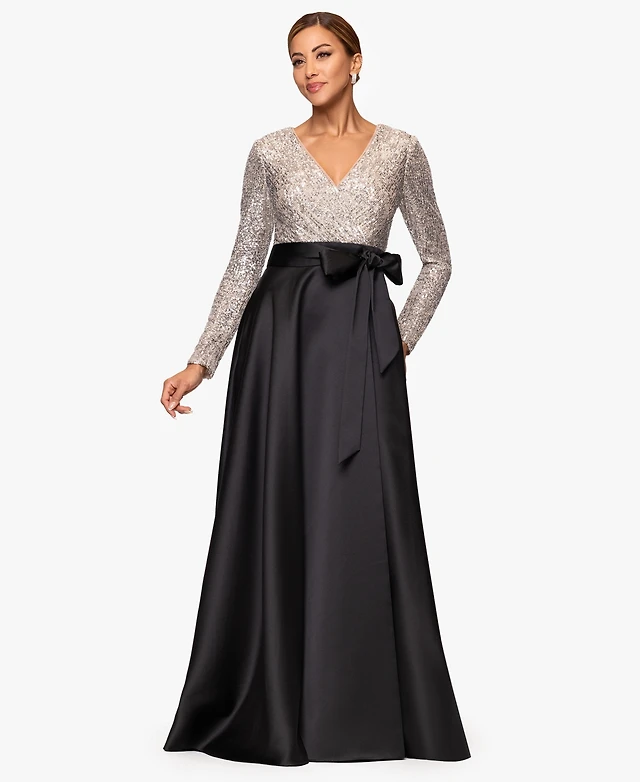 Xscape Women's Boat Neck Sequin Mesh Long Ball Gown