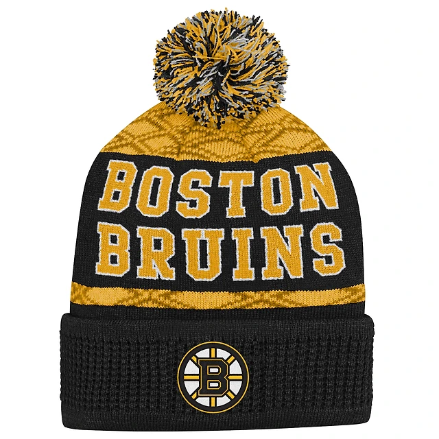 Youth Outerstuff Gold Boston Bruins Puck Pattern Cuffed Knit Hat with Pom