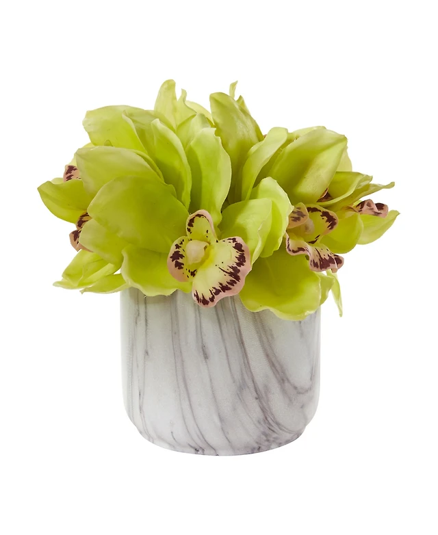 Nearly Natural Cymbidium Orchid Artificial Arrangement in Marble Vase
