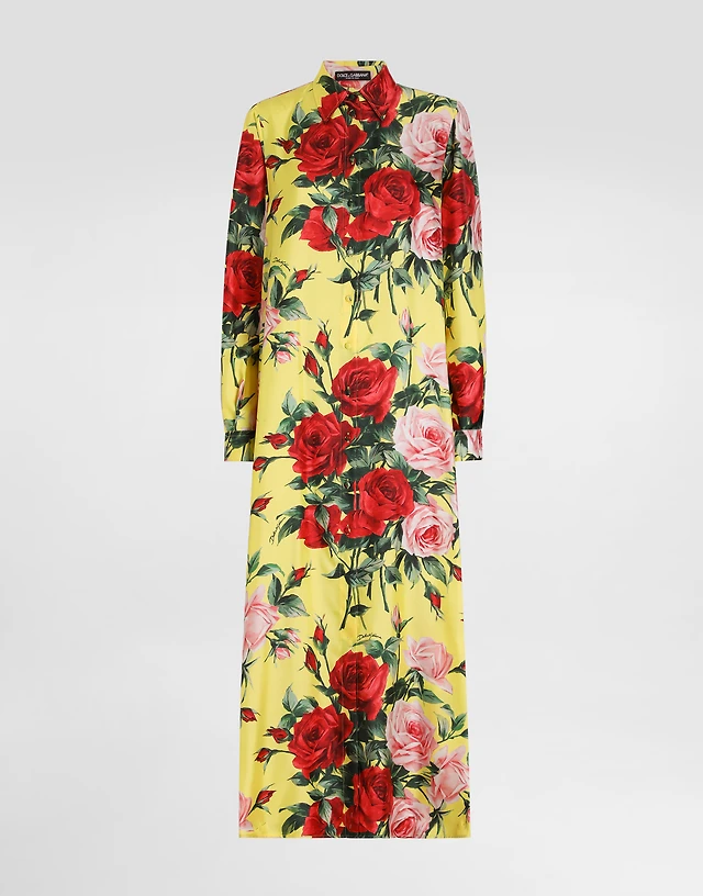 Cotton calf-length babydoll dress with rose print