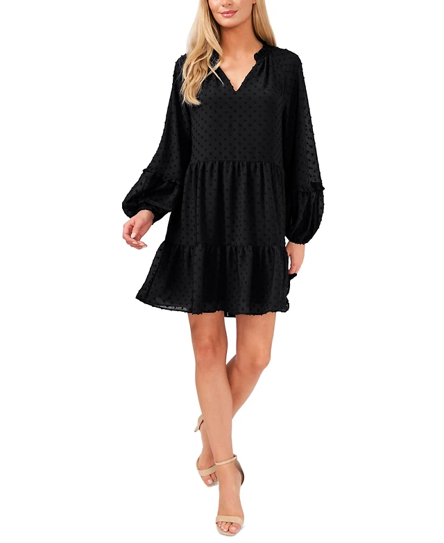Women's Long Sleeve Clip Dot Chiffon Dress with Smocked Waist and Cuffs