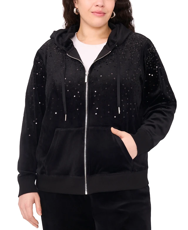 Karl Lagerfeld Paris Petite Velour Rhinestone Trim Zip-Up Jacket