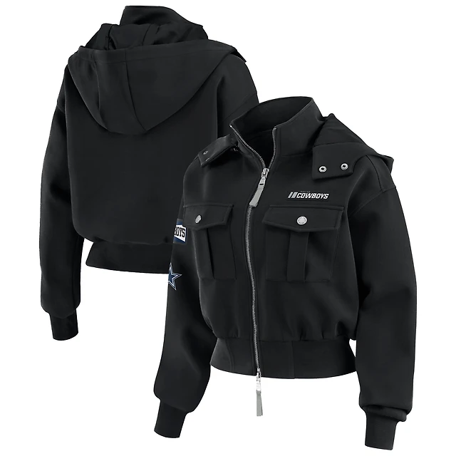 Women's WEAR by Erin Andrews Black Dallas Cowboys Tri-Blend Patch Pocket Cropped Full-Zip Bomber Hoodie Jacket
