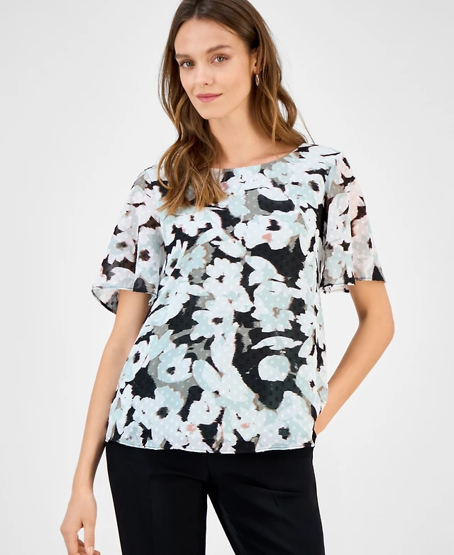 Kasper Women's Printed Swiss Dot Flutter-Sleeve Blouse