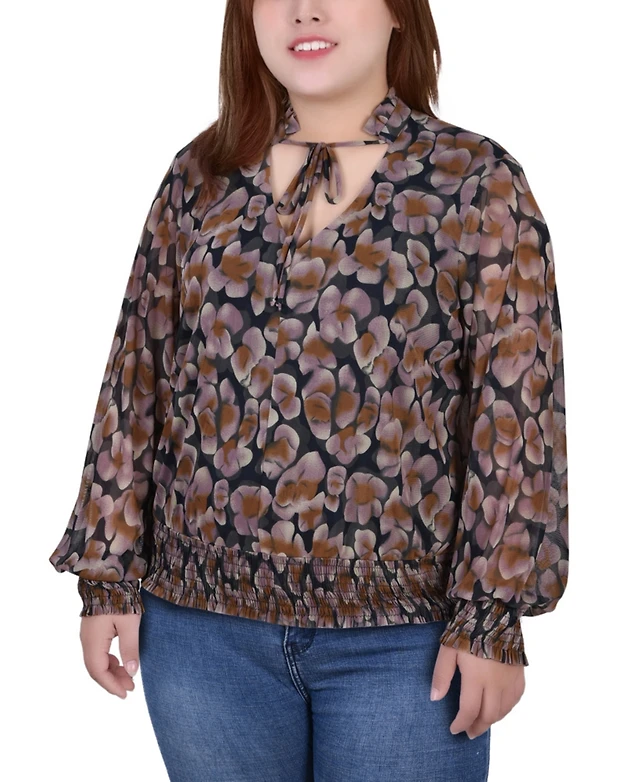 Ny Collection Plus Long Sleeve Tie Front Mesh Blouse
