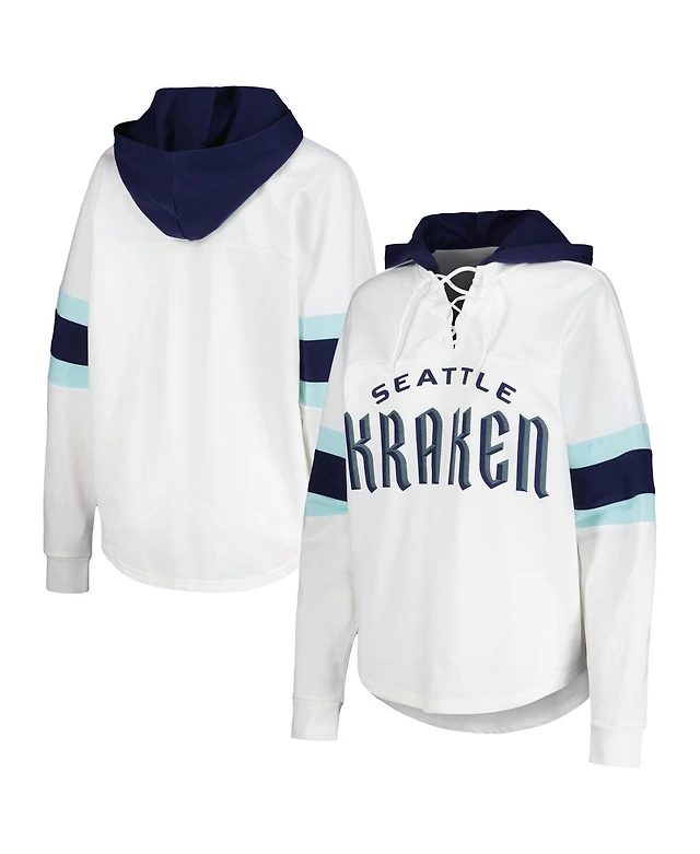 G-iii 4Her by Carl Banks Women's White/Deep Sea Blue Seattle Kraken Goal Zone Long Sleeve Lace-Up Hoodie T-Shirt