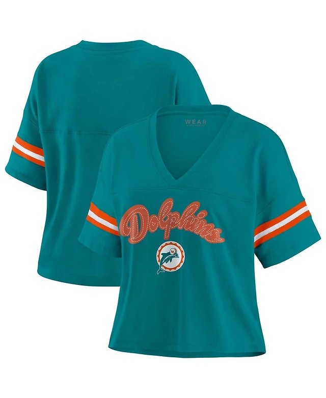 Wear by Erin Andrews Women's Aqua Miami Dolphins Color Block Boxy Modest Crop V-neck T-shirt