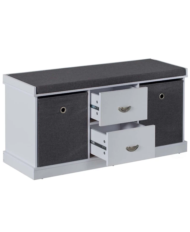 Basicwise White Shoe Storage Bench with Wooden Frame, 2 Drawers, Foldable Baskets, and Comfortable Gray Cushion for Entryway, Hallway, or Bedroom Orga