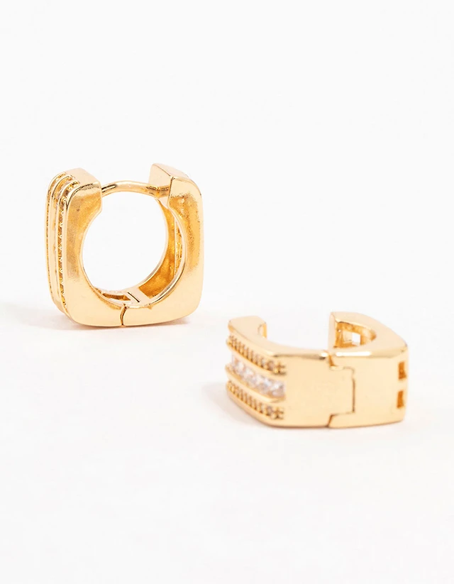Gold Plated Trio Pave Set Diamante Square Hoop Earrings