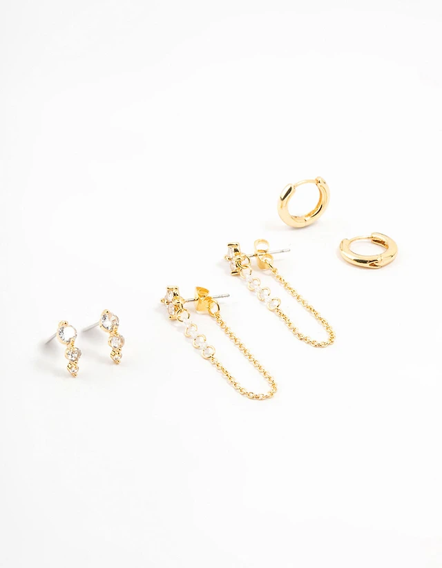 Gold Plated Cubic Zirconia Chain & Hoop Earrings 3-Pack
