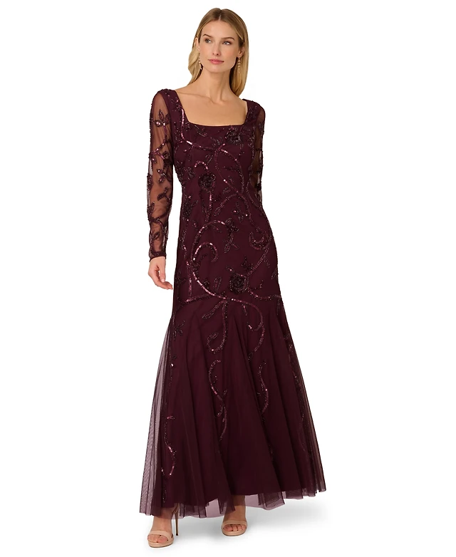 Adrianna Papell Women's Beaded Long Sleeve Dress