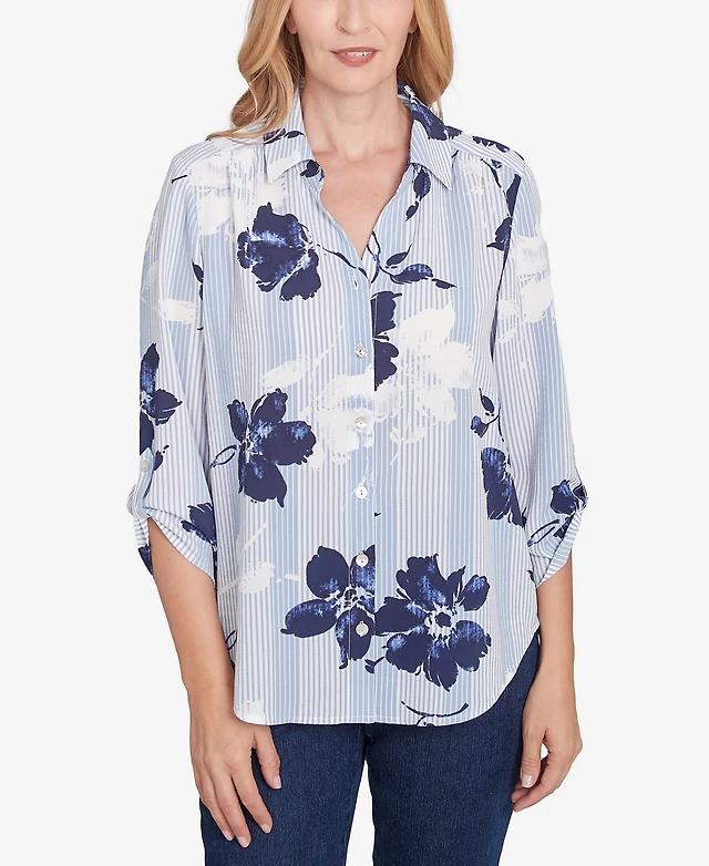 Alfred Dunner Women's Classic Striped Flower Button Front Tie Sleeve Top