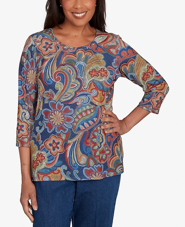 Alfred Dunner Women's Casual Vibe Pleated Paisley Crew Neck Top