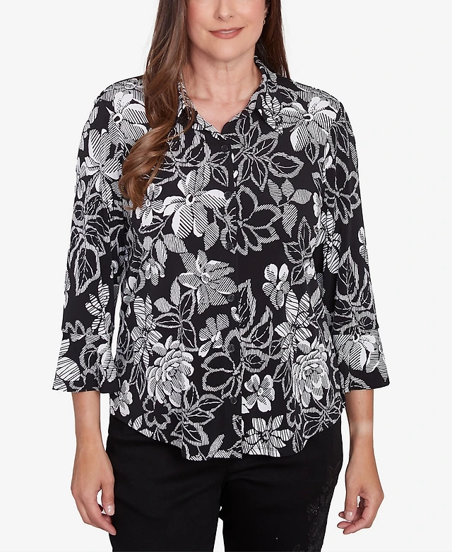 Alfred Dunner Women's Wild at Heart Floral Puff Print Button Down Top