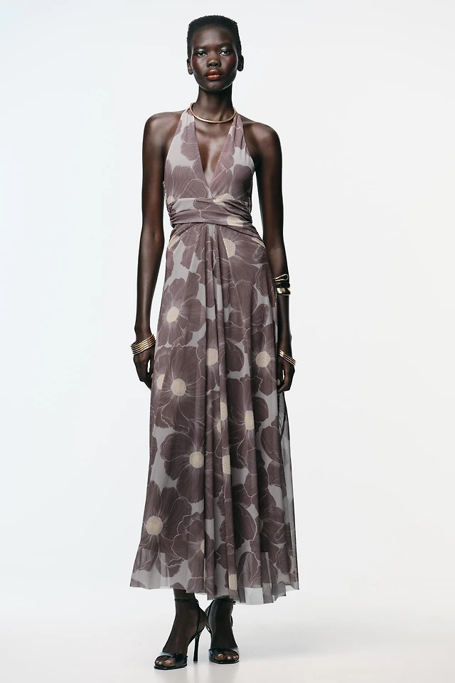 Printed Mesh V-Neck Cutout Open Back Ruched Maxi Dress