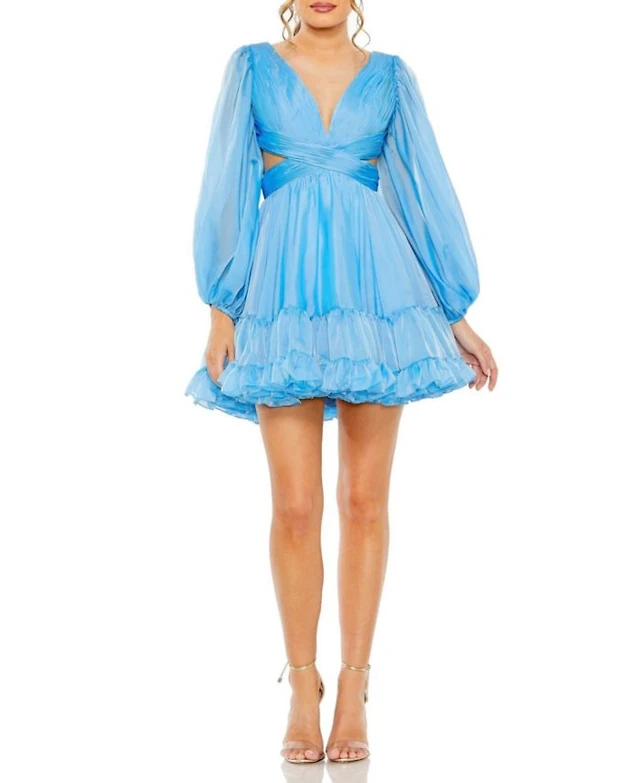 Flirty Chiffon Mini Dress with Puff Sleeves, Tiered Skirt & Daring Lace-Up Back