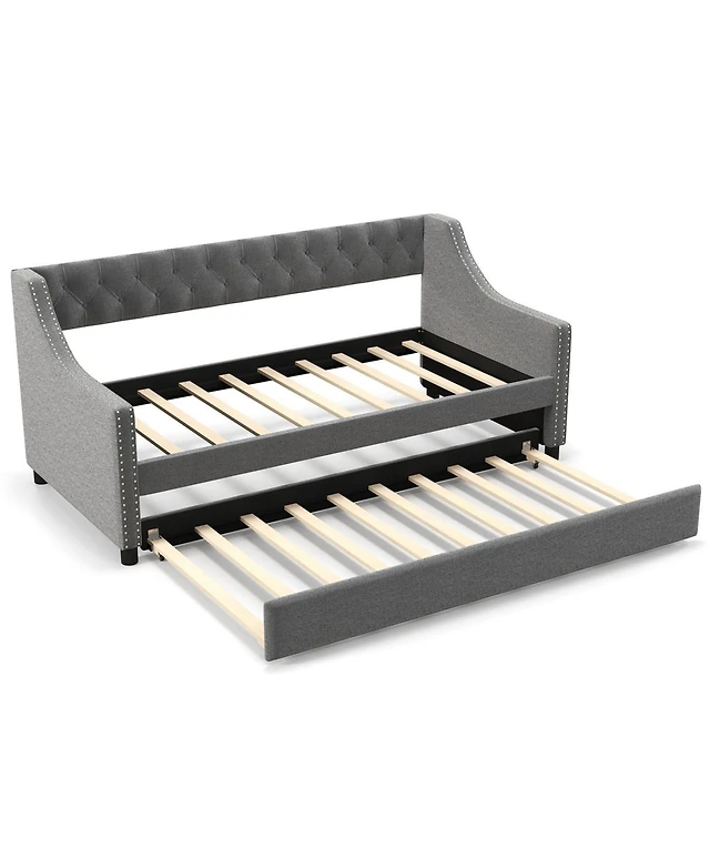 Gymax Twin House Bed Frame w/ Trundle Roof Wooden Platform Mattress Foundation Grey