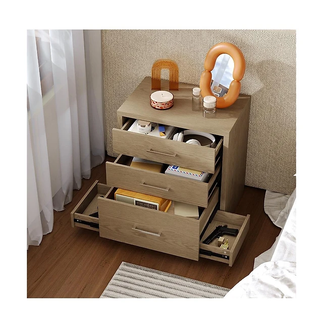 Bedside table with three drawers, side table with square handles, white wooden end table, suitable for bedrooms, living rooms, offices