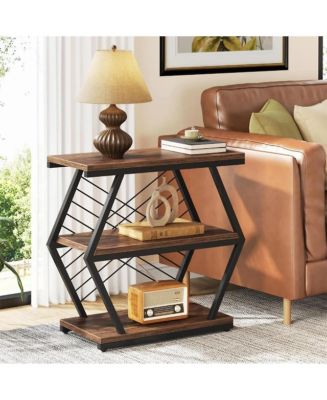 Tribesigns End Table, Industrial Side Table with 3 Storage Shelves, Wood Sofa Side Table with Geometric Metal Frame, Bedside Table for Living Room, Be