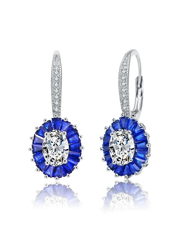 Sterling Silver with White Gold Plated and Blue Cubic Zirconia Leverback Earrings