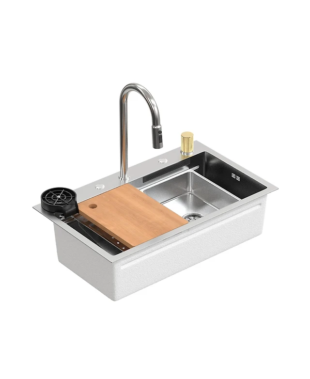 30-Inch Drop-In Single Bowl 304 Stainless Steel Kitchen Sink with Pull-Down Faucet, Cutting Board & Hidden Waterfall