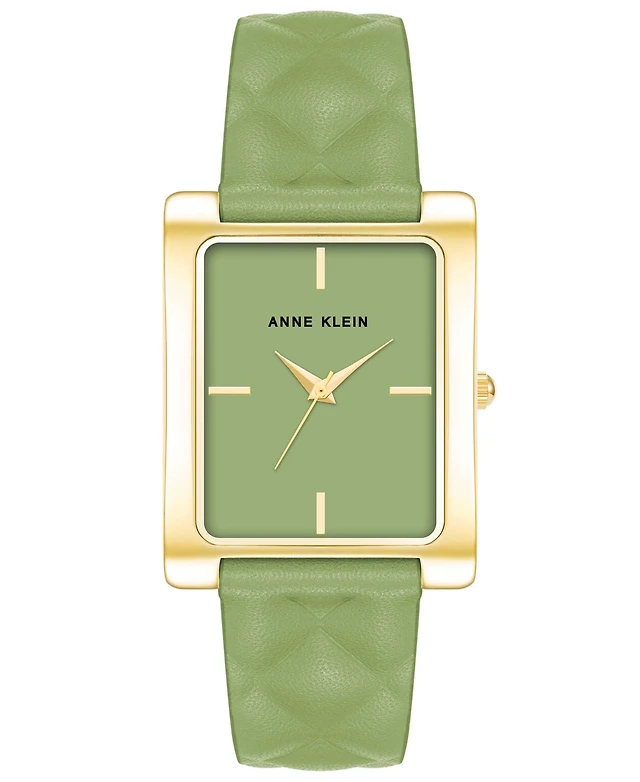 Anne Klein Women's Three Hand Quartz Rectangular Gold-Tone Alloy and Green Genuine Leather Strap Watch, 32mm