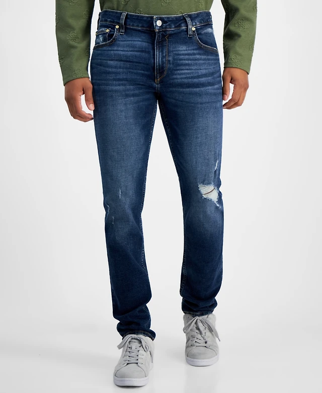 Level 7 Men's Dark Tint Destroyed & Mended Slim Straight Premium Jeans