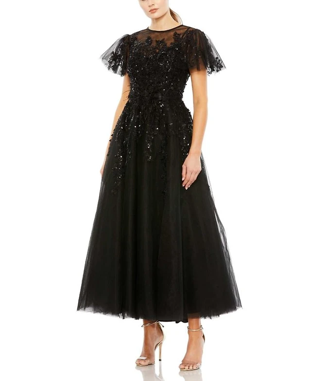 Embellished Long Flare Sleeve Mesh A-Line Dress