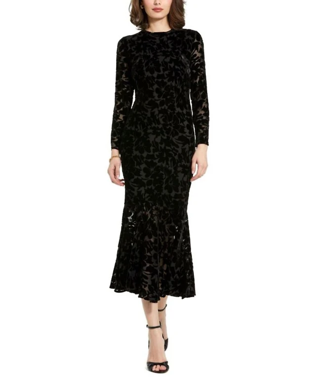 Burnout Velvet Long Sleeve Ruffle Hem Midi Dress