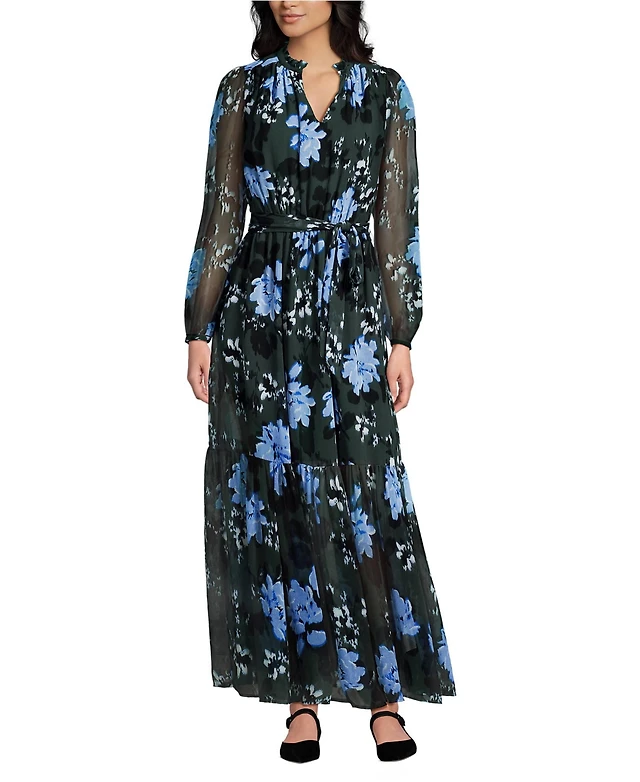 Betsy & Adam Plus Long-Sleeve Tie-Waist Long Dress