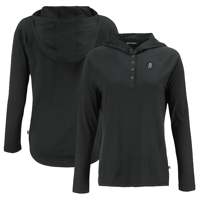 Women's Cutter & Buck Black Baltimore Orioles City Connect Coastline Epic Comfort Eco Recycled Hoodie Raglan Long Sleeve T-Shirt
